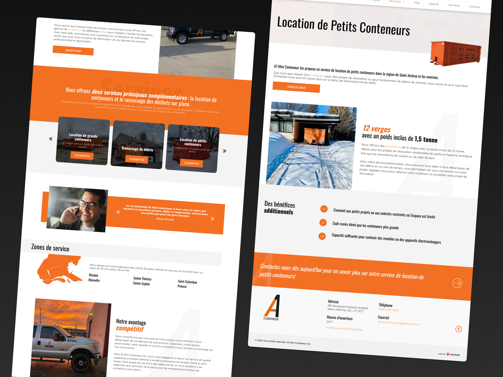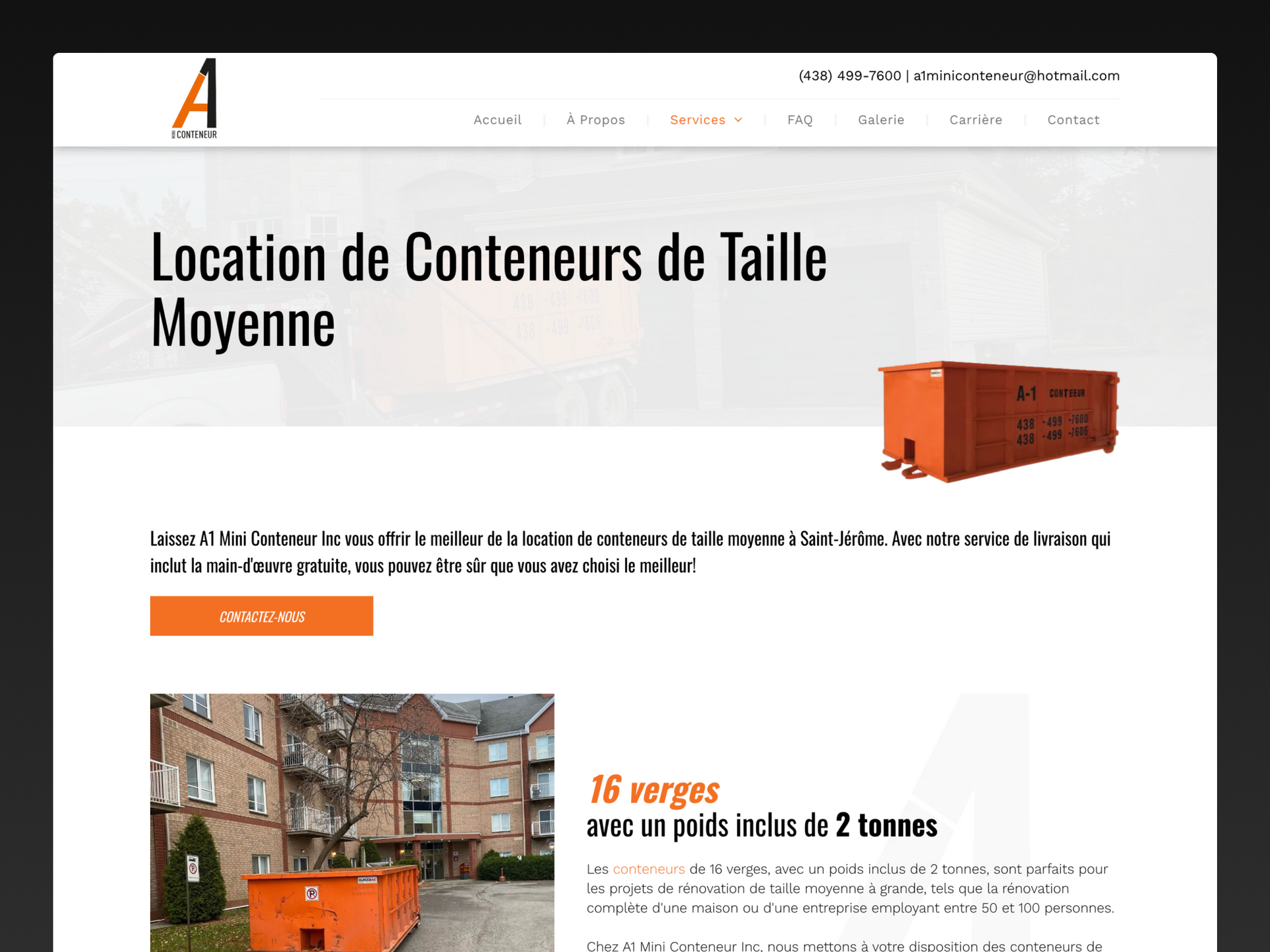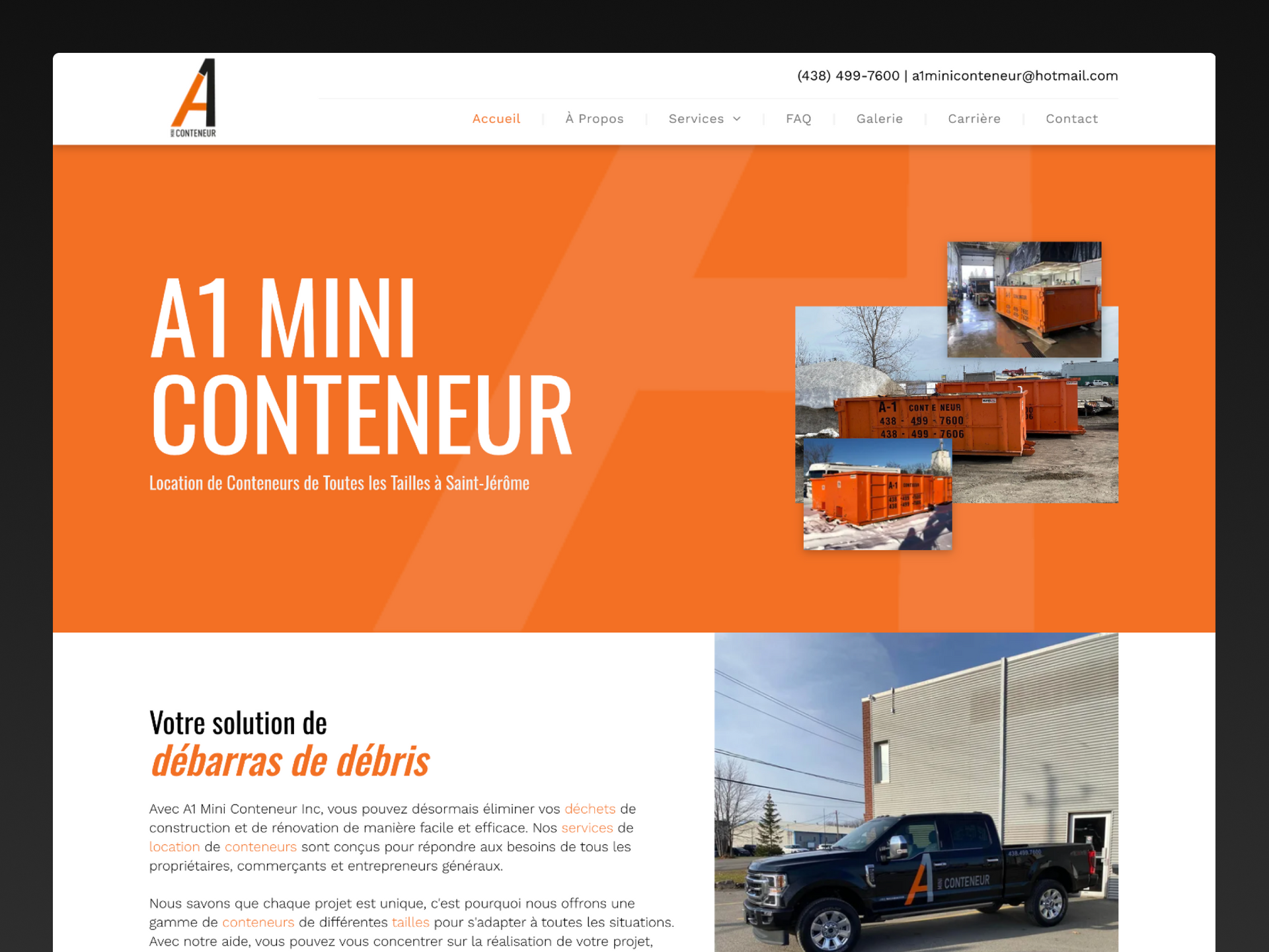 A1 Mini Conteneur Inc. provides reliable waste and debris removal containers to a diverse clientele, earning a reputation for excellent customer service and efficiency. My objective was to design a user-friendly website that allows their busy clients to quickly access the information they need.