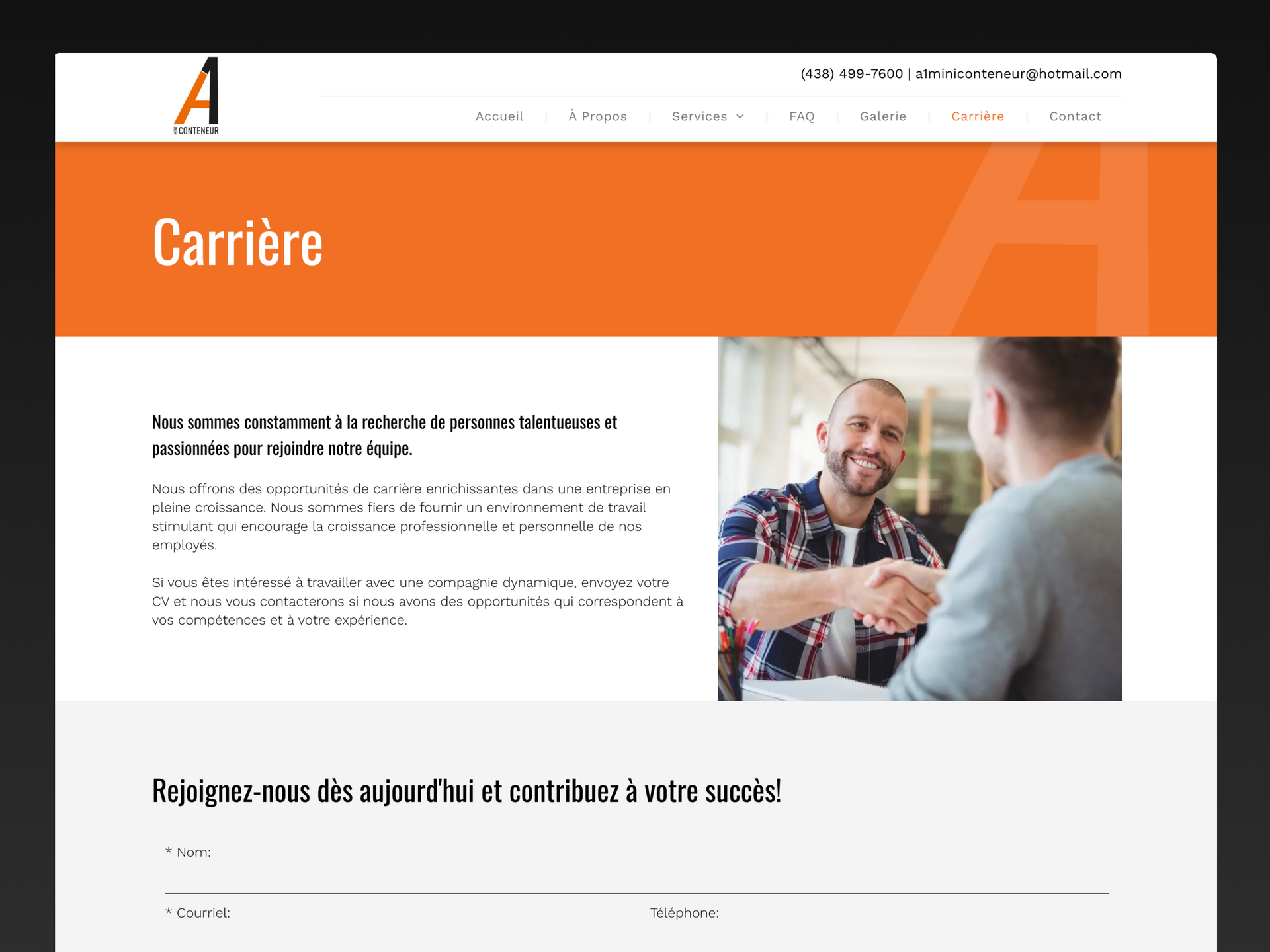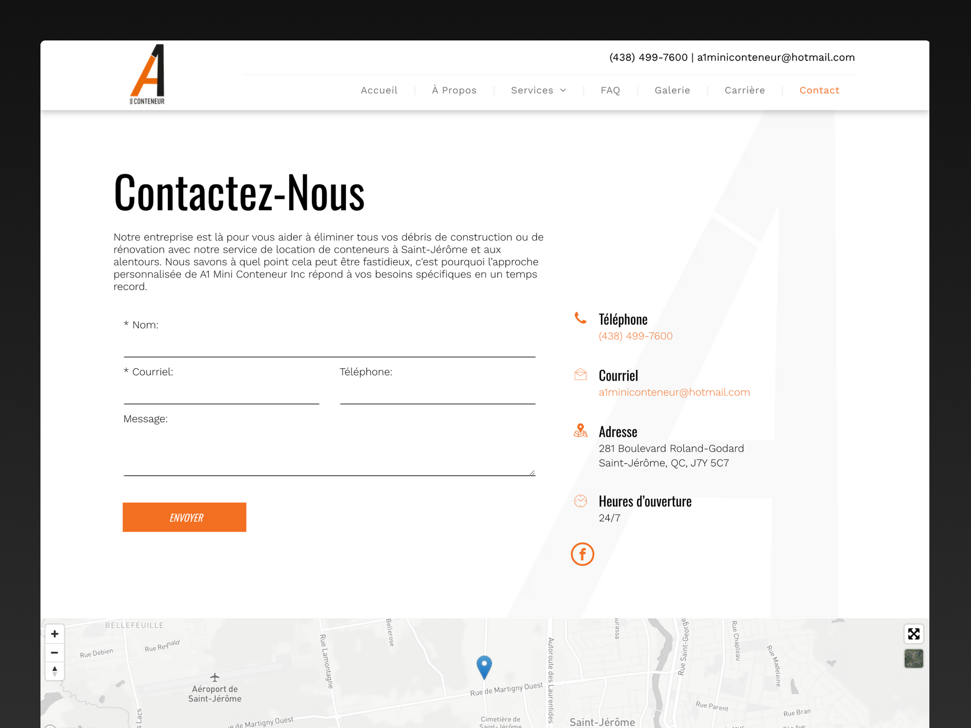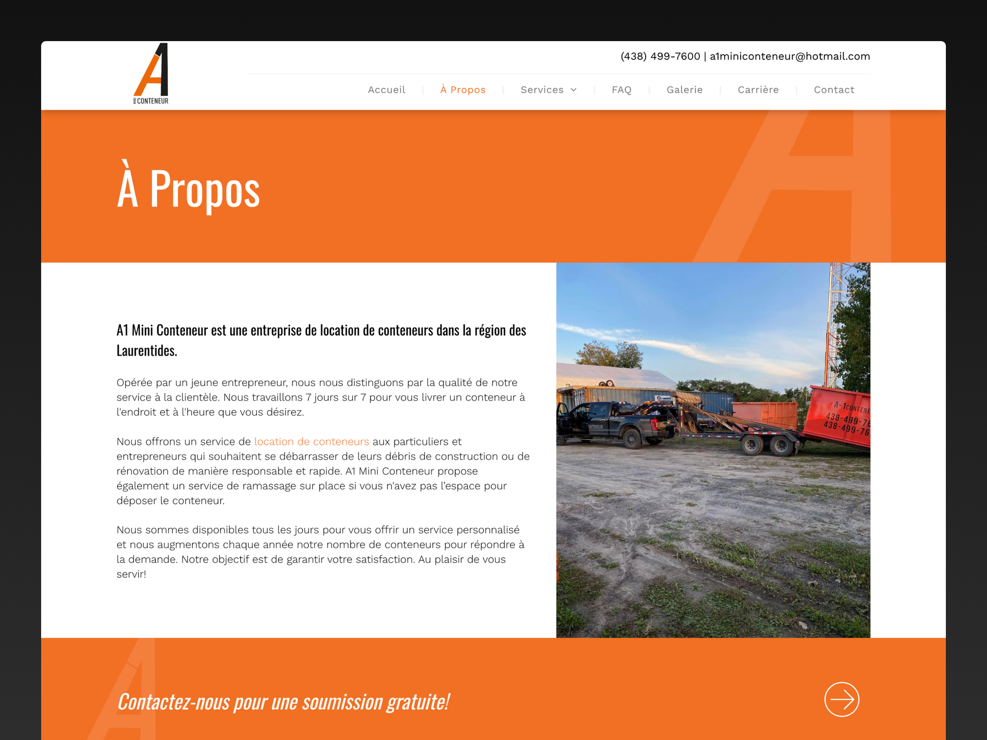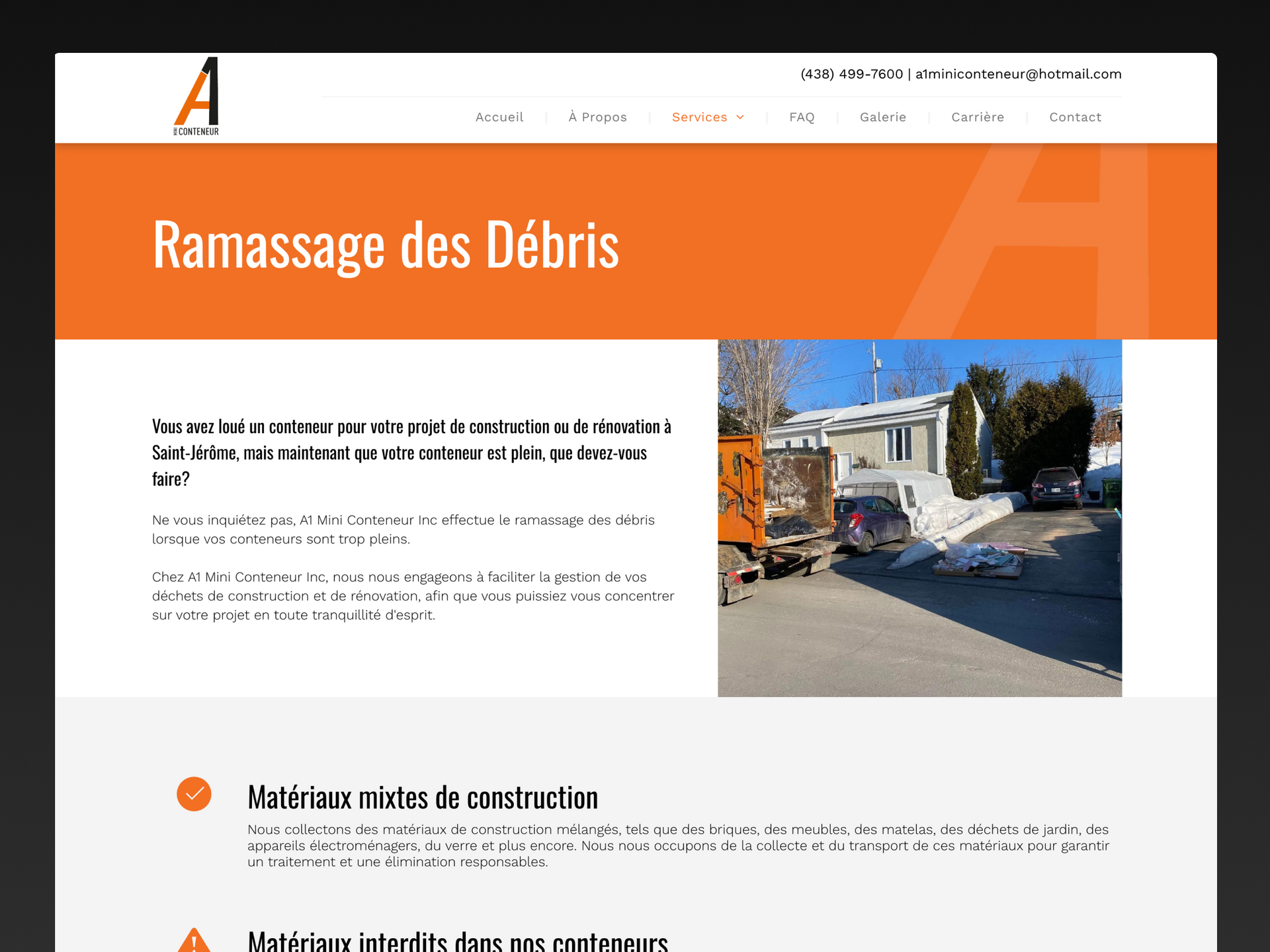 A1 Mini Conteneur Inc. provides reliable waste and debris removal containers to a diverse clientele, earning a reputation for excellent customer service and efficiency. My objective was to design a user-friendly website that allows their busy clients to quickly access the information they need.