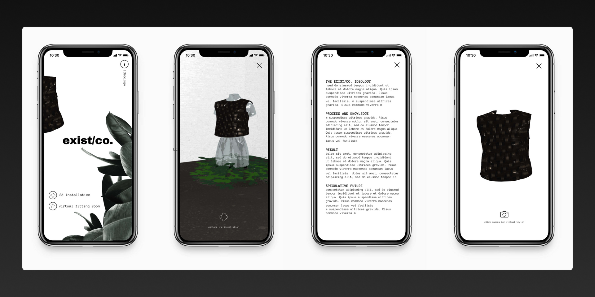 All the components of my research-creation project exist on a four page website. Including the landing page, the 3d installation/animation, a page that explains the project and a virtual fitting room where the garment can be tried on with your phone camera. I opted for an independent website over an app, due to wanting to limit the project’s dependence on larger corporations.