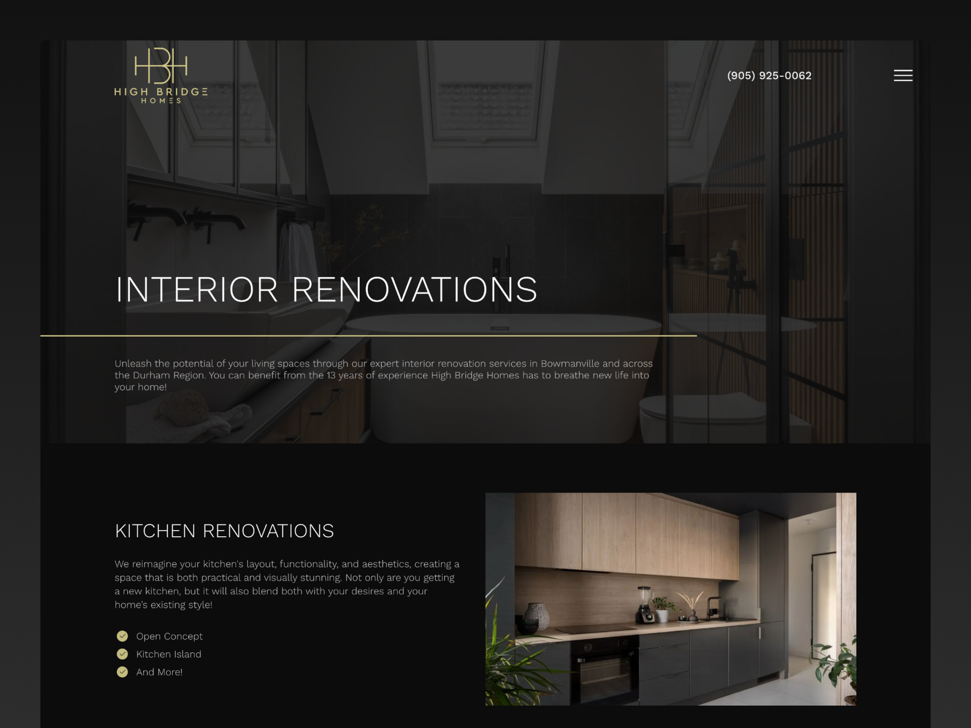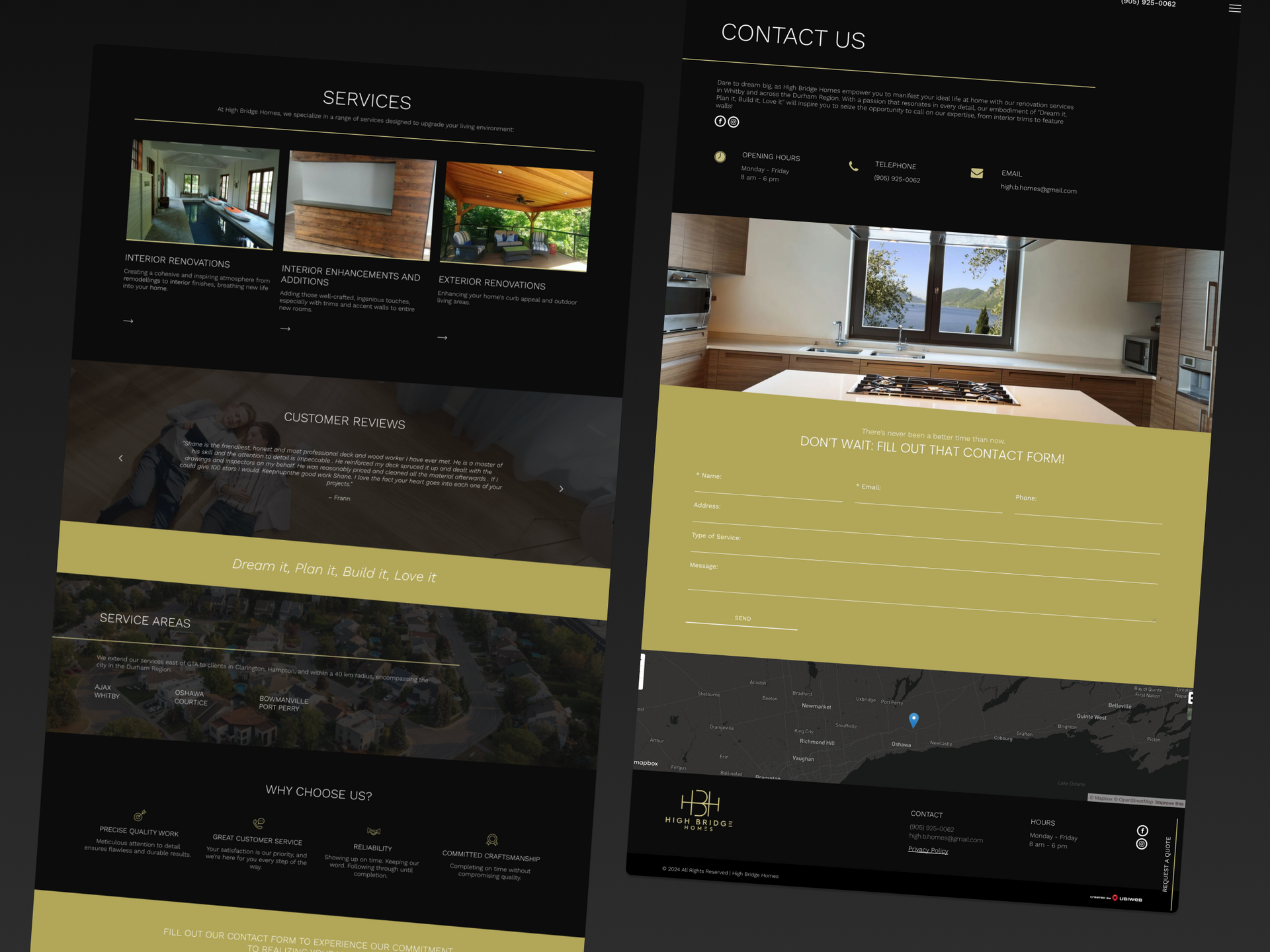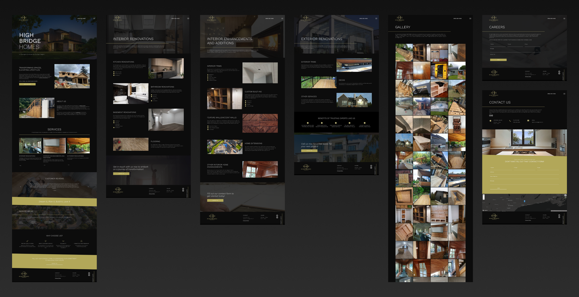 High Bridge Homes helps their customers transform their spaces and elevate their lifestyle. They sought a website with a clean, luxurious feel. Drawing inspiration from their logo, I delivered a professional design that emphasizes their craftsmanship in home renovations. Gold line accents guide users through the website, offering contrast to the otherwise dark theme. The design highlights their commitment to quality and reliability, with easy navigation across the service sections.